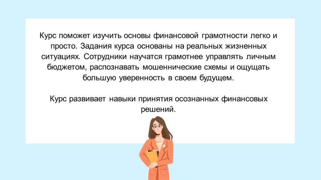☝🏻Из курса вы узнаете о том, как решать финансовые вопросы в конкретных жизненных ситуациях, какие инструменты для этого существуют и как ими пользоваться.